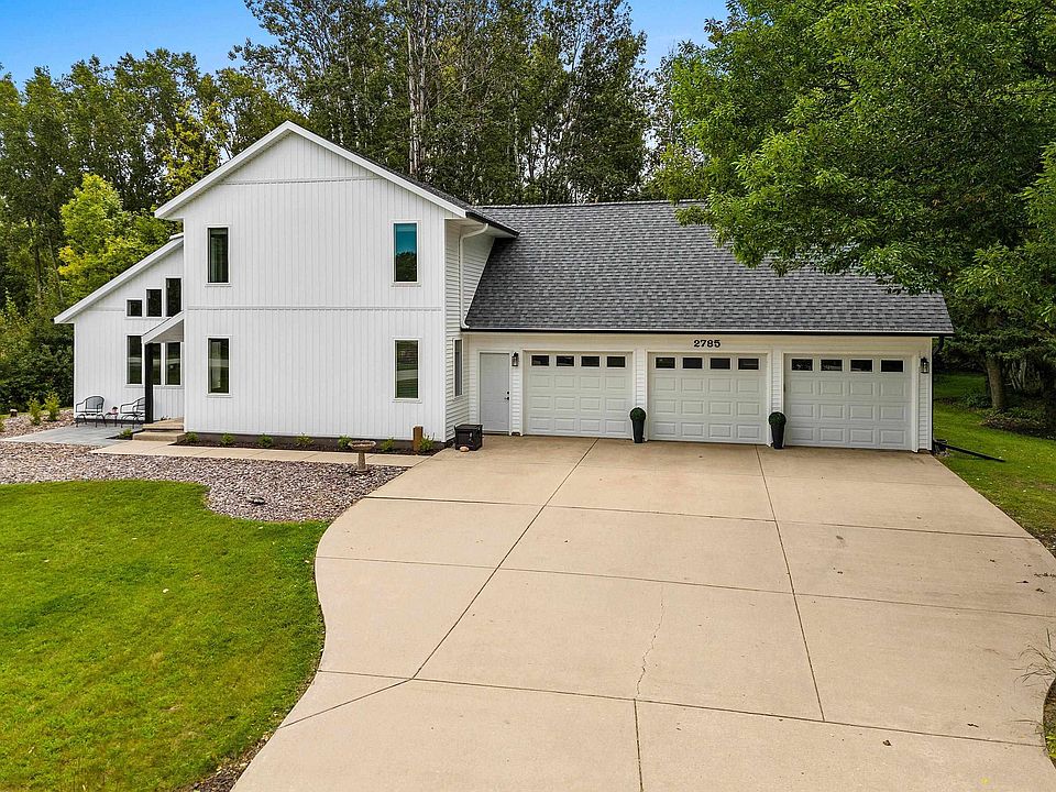 Stunning 1-owner custom 1.5 story on .767 acre lot w/woods & deeded access to Lake Leone right across the road. Swim, boat, fish & more! Many recent updates: roof, gutters, windows & siding ’23, carpet & wtr softener ’24, furnace ’21. Kit w/knotty pine cab, island, cer flr & appl. Soaring vltd LR clg w/vinyl plank flr & windows that welcome in the sunlight. The modern metal & wd open staircase leads to 2nd flr spacious primary suite w/cath clg, hrdwd flr, wk-in closet (plus huge wk-in attic storage), wk-in tile shwr, jetted tub, dbl sink vanity & tile flr. Adt’l bdrm up w/vltd clg plus open loft area w/new carpet. Main flr bdrm w/refinished hrdwd flr, full bath, 1st flr lndry, ceram foyer, C/A, Huge 3.5 car gar, maint-free deck, brick walkway to gar, walkway to storage shed, well & sewer.