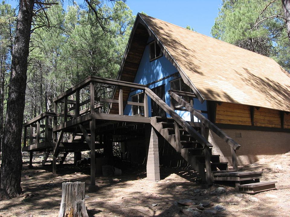 What a great lot and cabin in the pines! The heavily treed 35,852 sq. ft. lot is located on a cul-de-sac in Kachina Village. Enjoy the cool pines from the back deck and amazing views. The cabin has beautiful tongue and groove (T&G) ceilings. This A-frame is a perfect starter or get-away cabin with plenty of room to add-on.
