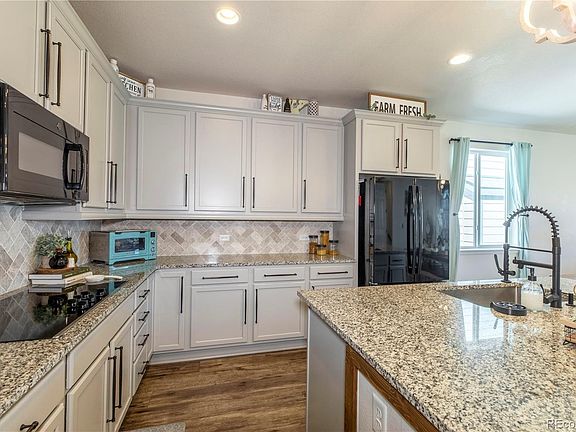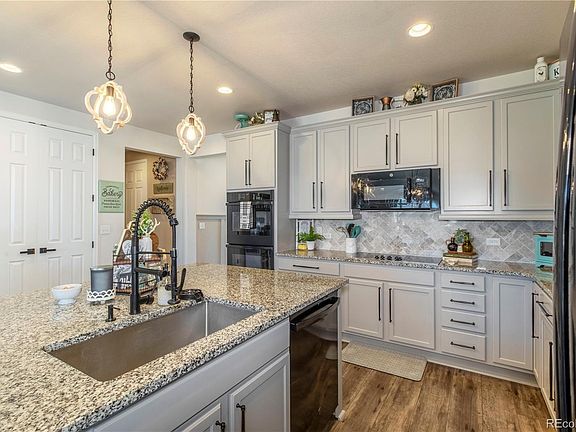 MUST SEE… UPDATED family home in Sky Ranch!! NEW/NEWER country finishes! Let’s start w the Main Floor… The Great Rm of this ranch-style floorplan is heart of this home! The Kitchen area includes a large island, 42”H uppers, upgraded hardware/fixtures, tiled backsplashes, double oven (appliances incl) & granite counters! The cozy Family Rm area features a windmill fan & bump-out w an electric fireplace – the perfect location for your TV! Large Dining Rm area for entertaining! The Primary Suite also has a bump-out w an electric fireplace & faux brick surfaces! It has a large, walk-in closet w a built-in organizer (as do all BR closets!)! The private, 3/4-BA welcomes you w double sinks, slat-board finishes, upgraded fixtures & a custom-tiled shower surround! Convenient Laundry/Mud Rm w a butcher block counter & utility sink! Two secondary BRs, perfect for an Office or Nursery, are just down the hallway, as is a Full-BA for their use! The Main Level has a covered deck w a ceiling fan & gas stub – goodbye propane tanks! Fenced bkyd & adjacent green belt/bike trail! Now for the finished walk-out Bsmt… It has 9-ft ceilings & includes a huge Family Rm, 3 BRs & a 3/4-BA! The Family Rm features another bump-out (#3!) w an electric fireplace & slat board finish! Custom bar area w quartz counters, custom-fab’d steel shelves, wet bar, dishwasher & steel wall panels! IT’S ABSOLUTELY A MUST SEE!! BR #4 is currently a Home Gym w 3 mirrors & rubber flooring! And the walk-in closet is currently a Gun Rm a counter & under-cab lighting! The Bsmt also includes BRs #5 & #6, and a 3/4-BA w a large vanity, quartz counters & custom-tiled shower surround! Other int improvements: oversized subpanel & egress windows! Ext improvements: NEW roof/gutters/downspouts, block retaining walls, shed, greenbelt access & patio! Oversized, 3-car garage w openers & remotes! Close to schools, DIA & Buckley AFB! Just off I-70! Quick access to E-470 & Southlands! Just 2-hrs to Summit County!