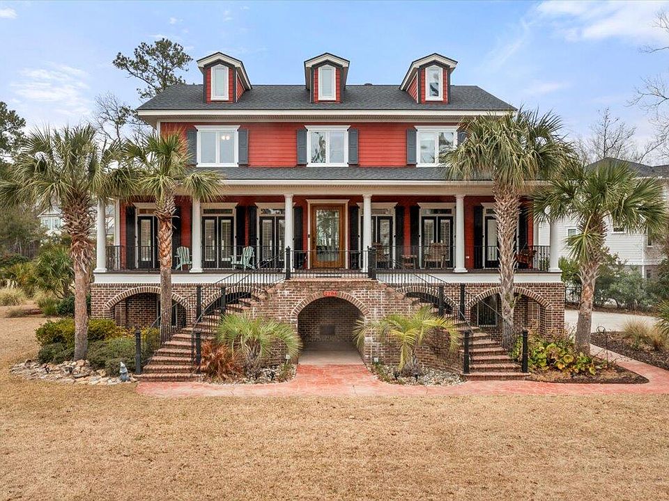 Located in Parkers Landing at Rivertowne Country Club, this elevated Low Country Style home has OVER $150,000 IN UPGRADES. The front of the home features two beautiful brick staircases leading up to a welcoming front porch, inviting you into the home through the custom etched glass door. As you enter the home through the foyer, enjoy the drop zone storage and private dining room. The chef's kitchen has no shortage of counter space with a large island and stainless-steel appliances. The kitchen flows into the living room featuring a vaulted ceiling that enhances the room's spaciousness and allows for extra natural light from the wall of windows.The primary bedroom on the main floor features an updated bathroom with a soaking tub and custom walk-in shower.Plus, a bonus features off of the primary bathroom is a bookshelf Murphy door that opens into a private office. Upstairs, there are four bedrooms equipped with California closets and two full bathrooms, offering ample living space. On the ground floor, you'll enjoy the garage of your dreams with custom cabinetry, built-in storage, and COASTAL STONE FLOORING, recognized in Charleston Home & Design Magazine. The ground level also includes a climate-controlled room with added mini-split (2021); perfect for a media or game room. The backyard has been expertly remodeled with a $94,000 investment, featuring an outdoor kitchen complete with a built-in grill and mini-fridge, lighted stone seating areas, and a stylish gas fire pit, perfect for entertaining and relaxation. The landscaping includes meticulously chosen plants and a NEW IRRIGATION SYSTEM (2023), ensuring beauty and ease of maintenance that complements the luxurious outdoor living space. With a full bathroom in the garage, you and your guests will have everything you need to enjoy your backyard oasis! Key updates in 2021 include a 3.5-ton Lennox HVAC system for the first floor, a TANKLESS HOT WATER HEATER, and NEW ROOF and gutters. Situated on a large corner lot, this home is just a short walk to Horlbeck Creek and a golf cart or bike ride away from Rivertowne Country Club, home to Charleston's only Arnold Palmer Signature golf course. Conveniently located only 12 miles from Isle of Palms Beach, and a short drive to local restaurants and grocery stores, this property combines privacy with accessibility, making it an ideal choice for those seeking a distinguished lifestyle in a vibrant community.
