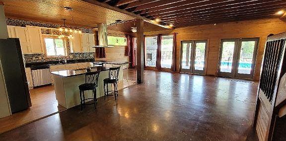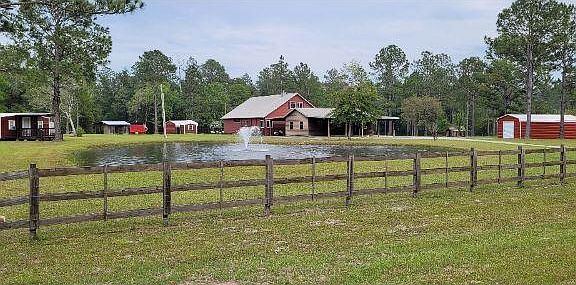 Welcome to Country living at its finest and this one of a kind, fully custom, one and a half story, Mountain Lodge style home situated on 5 acres just minutes from I-10 in Robertsdale. The main house is truly a one of a kind FULLY custom built hand crafted of solid pine and cedar inside and out. This is a very expensive home to build and was built to last for a very long time. Features include a pleasantly open floor plan with cathedral ceilings showcasing beautiful exposed beams, stained concrete flooring, a large wood burning fireplace, dining room, an open kitchen with stainless steel appliances, granite countertops with breakfast bar and custom lighting. The entire upstairs is the master suite and offers loads of natural light, vaulted ceilings, office built ins, a huge walk in closet, dual vanity sinks, garden tub, and separate shower. Two sets of French doors open to a raised deck with hot tub overlooking a salt water pool with private and secluded views down toward the creek. There are two guest bedrooms downstairs that have separate lofts with Jack & Jill bath and jetted garden tub. The exterior is natural cedar siding with two huge 40x12 and 40x12 covered porches that overlook the property. Attached to the main house is another 800 sqft heated and cooled insulated building that contains an arcade, tool/storage room and a gym, but could be used as additional bedrooms if needed, giving you a total of 5 bedrooms. In addition the property contains an additional one bedroom one bath private guest cottage, also a 600sqft metal insulated heated/cooled workshop/garage, 4 car covered carports, a nice sized pond stocked with bass and bream, a beautiful creek that flows the entire property across the back. Fruit trees including 20 producing blueberry bushes. This property has it all and is truly a rare find!! Don't miss this one!