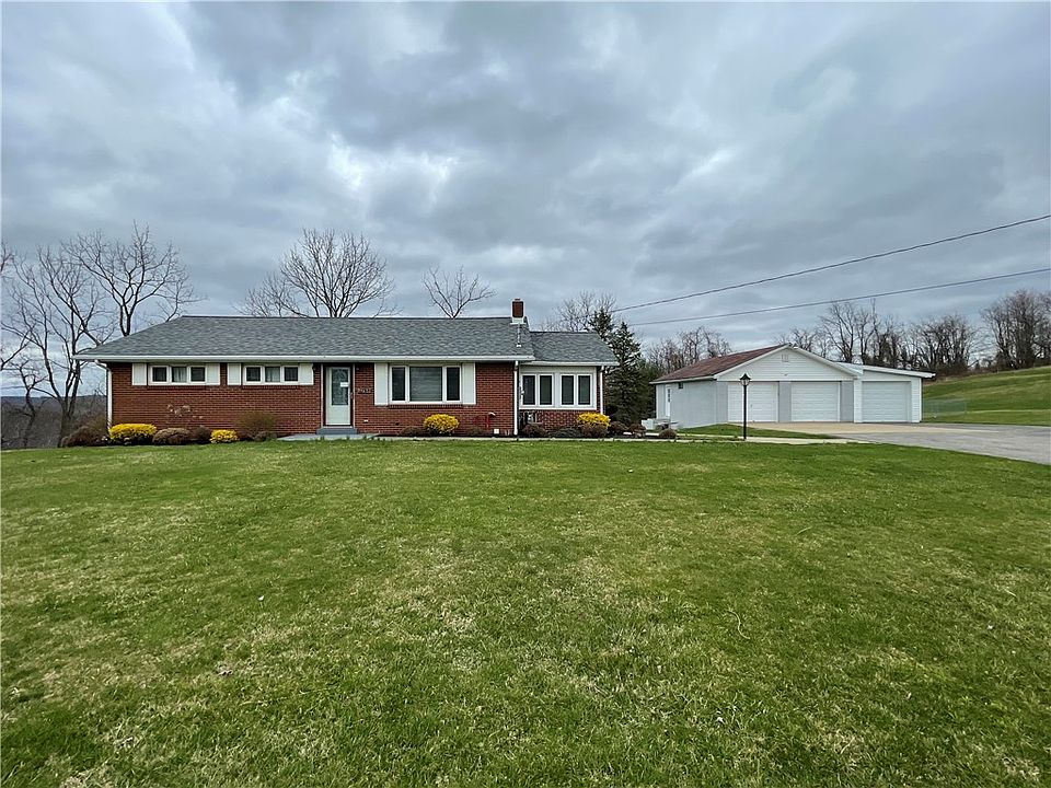 Home located in the country on 2.2 Acres!!! You will instantly fall in love with the kitchen that has tile floors, granite countertops, kitchen island, beamed cathedral ceiling and loads of cabinets!!! The main floor bathroom is even more amazing with a 6' claw tub, double vanity with makeup area w/ seating and a walk in shower with seating!!! You can shower or soak in the tub and watch the mounted TV in bathroom... The main floor has hardwood flooring... The lower level is finished with a Steelers themed Game Room that has built in surround sound and a wood burning stove... There is a closed in porch/patio area off the game room that can be used year round... There is also a closed in porch on the main level... There are 2 different driveways, one leading to the detached 3 car garage and the other one leads to the back of the home... There is a gorgeous pool with a concrete deck which is great for entertaining!!! There is also an outdoor bathroom with changing area for the pool...