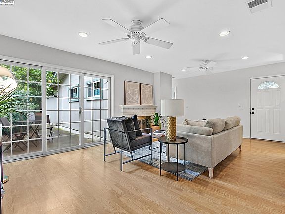 Cute and cozy single story duet with ample outdoor space, including a beautiful front yard, spacious and secure front patio, backyard and an additional small patio area off the family room. This home features a large kitchen, dining area and family room. The primary suite, with ensuite bathroom is oversized with a walk in closet and separate nook for office and/or sitting area. Both bathrooms feature updated showers. Two additional rooms complete this single level home with no steps. Newly painted with newer roof and skylights too! Located close to 680 and desirable San Ramon City Center. Top rated schools nearby!