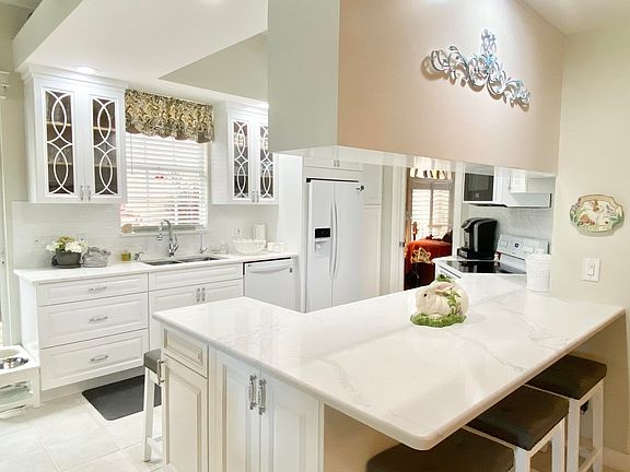 THIS PRISTINE ''OAKMONT'' SHOWS PRIDE OF OWNERSHIP. STEPPING INTO THE FOYER YOU WILL APPRECIATE THE ATTENTION TO DETAIL, FROM THE IMMACULATE TILE THROUGHOUT THE ENTIRE HOME, CROWN MOLDING, A COMPLETELY NEW KITCHEN WITH SOLID WOOD CUSTOM CABINETS, STUNNING QUARTZ COUNTERS, TOP OF THE LINE APPLIANCES, DESIGNER BACKSPLASH. THE GREAT ROOM BOASTS 12 FT CEILINGS AND OPENS TO THE DINING AREA AND KITCHEN, PERFECT FOR ENTERTAINING. PLANTATION SHUTTERS IN THE DEN,BEDROOMS,GARAGE. THE MASTER SUITE HAS A UNIQUE DUAL BATHROOM ARRANGEMENT, SHOWER &VANITY ONE SIDE, ROMAN TUB & VANITY THE OTHER. WALK IN CLOSET IN THE MASTER WITH EXTRA SHELVING. SPLIT BEDROOM PLAN OFFERS PRIVACY, LAUNDRY ROOM HAS PLENTY OF STORAGE, UTILITY SINK, A/C 2 YEARS OLD, WATER HEATER REPLACED 2013, SOLAR PANELS ON ROOF VIRTUAL
