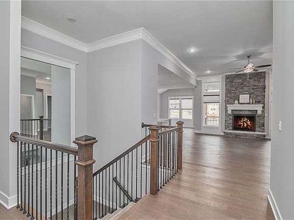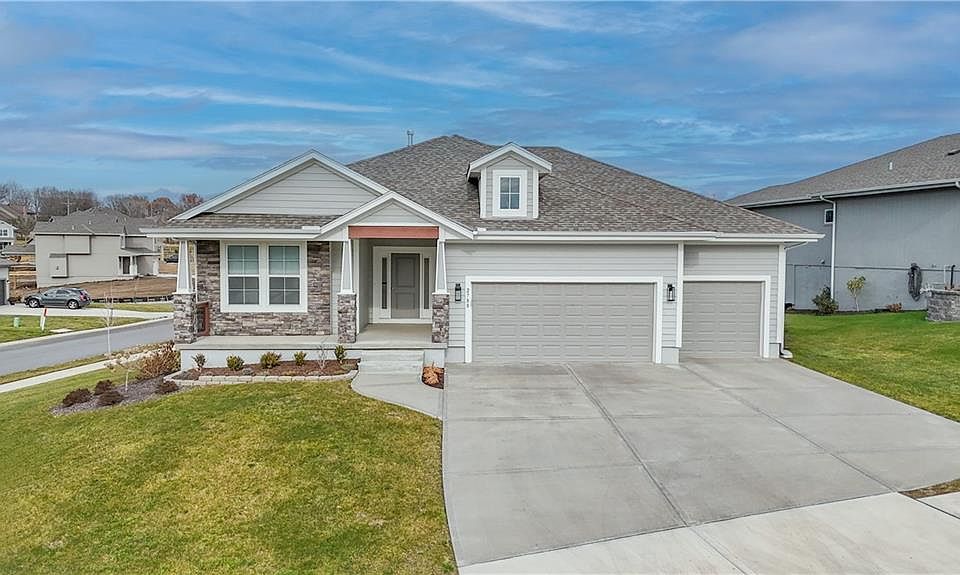 Lived in less than 1 year. The seller now needs a 2 Story and their move creates an amazing opportunity in a near new home. Better than new is TRUE as the new refrigerator, washer/dryer stay as well as a house full of beautiful Hunter Douglas blinds. This Reverse home is truly OPEN CONCEPT. Tall ceilings, beautiful open staircase to the Lower Level, abundant light pouring in and a floor to ceiling stone fireplace at the center of it all. Nestled in the heart of the prestigious Olathe School District, this home ensure access to a top-notch education. Prairie Farms has a community pool, play area, trails and lots of community fun. Enjoy the convenience of being within walking distance to the recently updated Lake Olathe, offering a picturesque escape to the outdoors. Disc golf, swimming, shelters, trails, canoe/kayak rental and an AquaPark. Contact the agent for more information and a private tour!