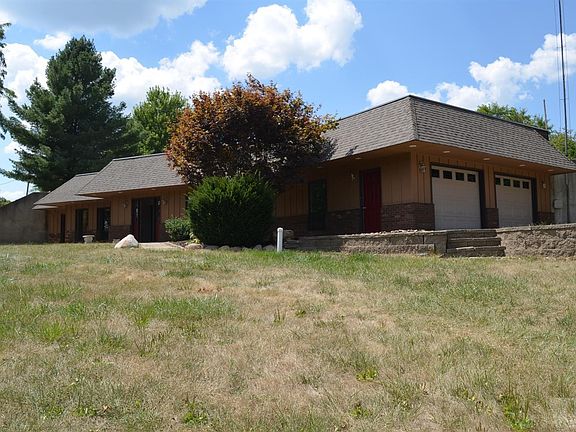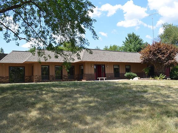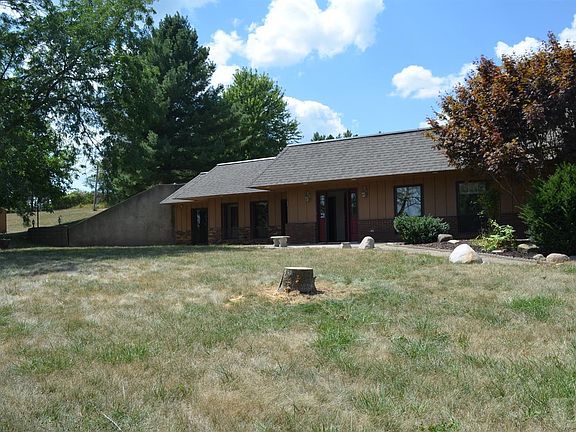 Beautiful views from this acreage, overlooks pond, timber, and fields. Berm home offers large and open spaces. Updated kitchen, wood stove in living room, views from both. Bonus entertaining room with sauna. Nice patios for relaxing. Attached garage. Additional outbuilding (32x24 with lean-to) for extra storage or workshop.