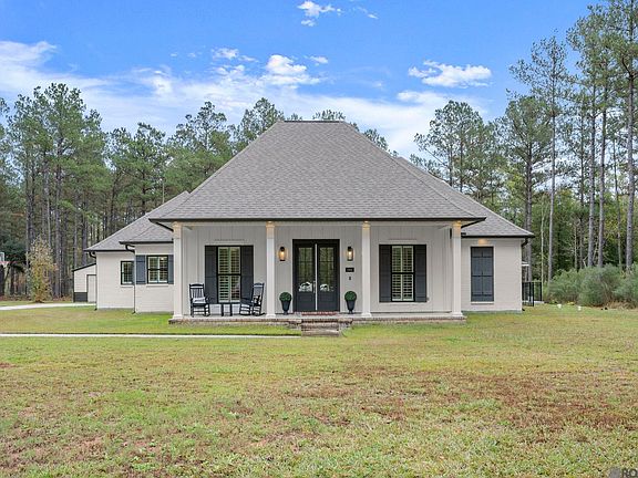 Welcome home to this beautiful 4 bedroom, 2.5 bath custom Acadian-style home situated on 2 acres in desirable Livingston Farms. Only 5 years old, this home offers a functional triple-split floor plan with high-end finishes throughout. The open living area features a gas fireplace, polished concrete floors, and a wall of windows overlooking the backyard oasis. A brick arch with a cypress beam leads into the kitchen, which includes leathered granite countertops throughout the home, stainless steel appliances, a gas cooktop, a large walk-in pantry with a window, and an office nook conveniently located in the laundry room. Custom trim work above the windows and plantation shutters throughout add to the home’s detailed craftsmanship. The private primary suite includes a stand-alone soaking tub, custom tile shower with a bench, and a large walk-in closet with built-ins. The additional bedrooms are well-sized and thoughtfully positioned for privacy. Outdoor living is exceptional with a saltwater gunite pool featuring a tanning ledge and hot tub, extended concrete decking, and an iron fence. The new cabana offers stained wood ceilings, recessed lighting, dual fans, a brick accent wall, mounted outdoor TV, and a spacious open-air seating area overlooking the wooded acreage and pool. The rear covered patio also includes a full outdoor kitchen ideal for entertaining. An 18x24 shop off of the driveway provides added storage or workspace. As an added bonus, this home is located in flood zone X so no flood insurance is required. This property blends peaceful acreage living with modern amenities and timeless custom details throughout. Schedule your showing today to see all this beautiful home has to offer!