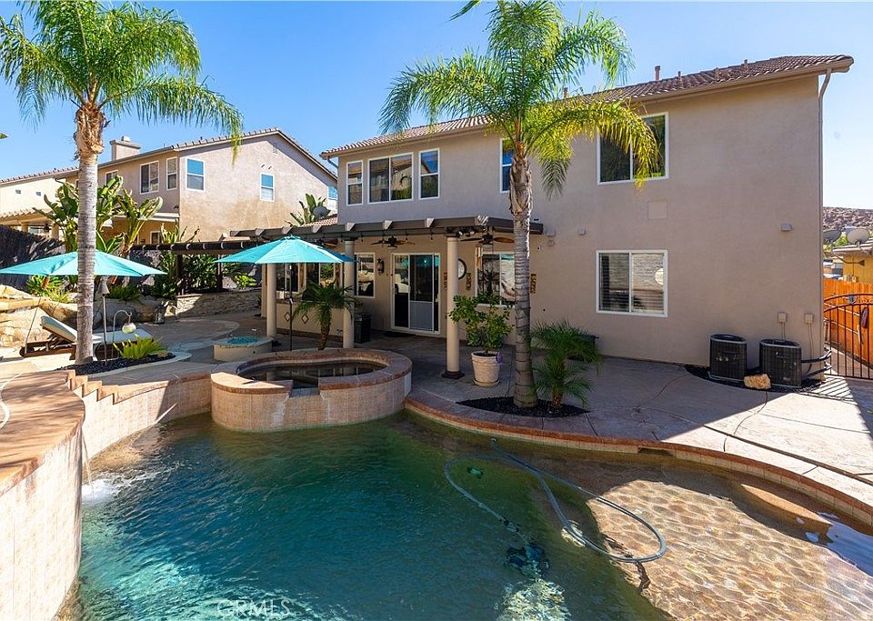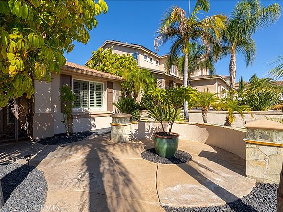 This amazing home offers exquisite living experience including 28 PAID SOLAR PANELS with SOLAR EDGE INVERTER worth $30,000 and a stunning SALTWATER POOL AND SPA with NO HOA. Expansive driveway, ARTIFICIAL TURF, LUSH LANDSCAPING and STAMPED CONCRETE walkway leads to a gated entry to an 8 FOOT CUSTOM TITAN ENTRY DOOR. Step inside a grand foyer adorned with SOARING CEILING, stunning WROUGHT-IRON STAIRCASE and WOOD FLOORING. To your right is a formal living and dining area with TILE FLOORING, GENEROUS WINDOWS and TAILOR-MADE SHUTTERS. Across the hallway are 2 DOWNSTAIRS BEDROOMS - one with WALK-IN closet, sharing a Jack-N-Jill Bathroom with DUAL SINK, functional flooring and STAND-IN SHOWER. Powder room offers a unique RIVER ROCK COUNTER TOP, DISTINCTIVE SINK and VENITIAN PLASTER WALL. In the laundry room you will find a WASH SINK, cabinets and access to the 3-car EXTENDED GARAGE (TO PARK YOUR TRUCK) with INTERLOCKING TILE FLOORING and 220 AMP OUTLET for Tesla charging. Upgraded kitchen is a chef’s vision complete with CHERRY WOOD CABINETS, STONE COUNTER, STAINLESS STEEL APPLIANCES including a 5-BURNER GAS COOK TOP and RANGE HOOD, REVERSE OSMOSIS WATER FILTER, a CENTRAL ISLAND with EXTRA SINK, GARBAGE DISPOSAL and EAT-IN BAR, and a WALK-IN PANTRY with CUSTOM DOOR. A beautiful great room offers a CEILING FAN, BUILT-IN ENTERTAINMENT CENTER, SURROUND SOUND, and a cozy FIREPLACE. Upstairs you will find the shared bathroom and 3 bedrooms including the spacious PRIMARY SUITE features WALK-IN CLOSET WITH BUILT-IN DESIGN and CUSTOM MIRROR DOOR and an adjoining bathroom offering a luxurious spa-like experience with DUAL VANITY, SOAKING JETTED TUB, and WALK-IN SHOWER. Your private oasis includes an EXTENDED ALUMAWOOD PATIO COVER with CEILING FANS and SUN SHADES. The spectacular SALT-WATER SWIMMING POOL AND SPA features MULTIPLE WATER FALLS, PEBBLE TECH COATING, PENTAIR POOL LIGHTS and AQUALINK SYSTEM. The backyard also includes a GAS FIRE PIT and an OUTDOOR KITCHEN which includes a BLAZE BUILT-IN BBQ worth $4000 and a NEW OUTDOOR FRIDGE beautifully landscaped with decorative rock walls, plumerias, palms and hibiscus plants. Other features include CUSTOM WINDOW VANLANCES and KOHLER ELONGATED TOILETS throughout, 5 Bedrooms with CUSTOM CLOSET ORGANIZERS, 3 with CUSTOM MIRROR DOORS, SHUTTERS, 50-GALLON RHEEM PLATINUM HOT WATER HEATER, PERGO FLOORING worth $5,000, NEW WATER SOFTENER, WHOLE HOUSE FAN, SECURITY UNIT and SPLIT HEAT/AIR UNIT. This truly is a remarkable find!