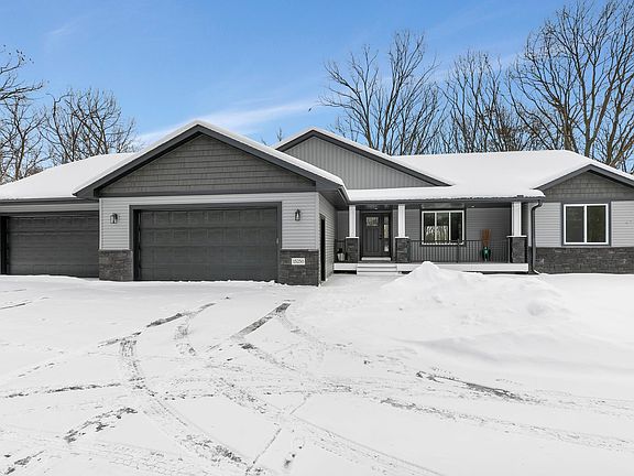 Elegant and stunningly beautiful, this model home is located in a beautiful wooded setting. This gem offers 3 bedrooms, 2 full bath, 1 half bath located on the main level. Spacious open-concept kitchen, dining room and living room with main floor laundry. Kitchen has custom alder woodwork, cabinetry and granite countertops. Vaulted ceilings, a gas fireplace with a stone surround and luxury vinyl plank flooring. Bedrooms are carpeted and primary bath has tile flooring. Oversized 6 stall attached garage, each door is 16X8, first and second stalls are 26 feet deep, the third and fourth stalls are 38 feet deep. Garage has gas line hook up. Asphalt driveway, vinyl siding with cultured stone. Mature trees, wooded and private. 3.49 acres close to Elk Lake. One more lot available...This is home!