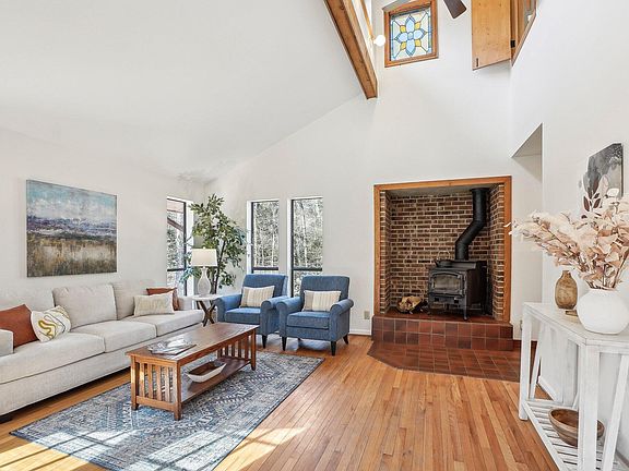 Longing for an idyllic woodland sanctuary? This modern home with rustic charm is situated on a sprawling five-acre lot. Large decks and patios surround the home and provide space for both intimate and large gatherings.The brick floor and skylights in the rear sunroom will warm your feet as you cozy up with a book. Gaze out over your huge private yard where you and your friends and family can enjoy nature, wildlife, a fire pit, and even lawn games. Indoors the vaulted ceilings in the living room bring a spacious feel, and the wood-burning stove adds visual appeal and plenty of extra warmth if needed. The warmth of wood throughout the home adds to the outdoorsy charm, with a beautiful view from every window! The primary bedroom is downstairs and has its own entrance to a small covered patio. Upstairs are two additional bedrooms and a bathroom. One bedroom has a covered balcony, and the other has a large closet with access to additional attic storage. Either room would make a great home office, and high speed internet is available for those that work from home. Big outdoor projects are no problem, as the large gravel driveway can hold many vehicles, and there is a carport for your use if you desire. The lighted shed is large enough to use as a workshop. Set up your personal homestead with a fenced in garden area and even a chicken coop! Heading out for a meal or shopping? In addition to the stores and restaurants at White Cross and 54, you are centrally located and have choices. This home is under 20 minutes to Chapel Hill and Carrboro, under 20 minutes to Saxapahaw, and under 30 minutes to Pittsboro and Hillsborough. You are less than an hour from Durham, Raleigh, and Greensboro so have many choices for fine dining, museums and performing arts within driving distance. This home is zoned for Orange County Schools. Hot water heater replaced 2021, new well pump 2021, new well pressure tank 2025, new roof 2025, gravel driveway regraded and refreshed 2025, interior paint 2025.