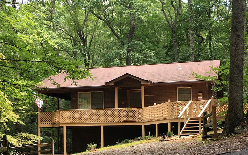 Fantastic cabin in very desirable location just minutes from Vogel State Park, the Appalachian Trail, and numerous hiking trails and trout streams! Extremely well kept home, clean as a whistle, with spacious great room featuring brick fireplace with gas logs, new laminate flooring throughout main level. Main floor master bedroom is quite spacious, and downstairs bedroom is almost as large. Den or family room on lower level could be used as 3rd bedroom, home office, game room or TV room. Spacious laundry room plus mechanical room and loads of storage. Current owners have used as a rental and have done very well. Outdoors includes fenced pet area, oversized deck and covered porch, with low maintenance landscaping!