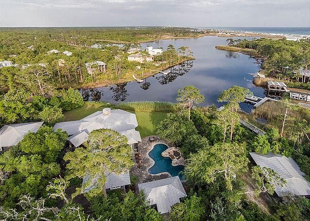 This estate is nestled in the heart of the historic and eclectic community of Grayton Beach on approx 1.4 acres. Located on nearly 200 feet of Western Lake this exceptional compound offers 4 separate buildings for comfortable living. All are shaded by southern magnolias, towering pines and moss-draped oaks. The spherical living room with a wrap around porch offers expansive views across Western Lake, to the white sand dunes and the Gulf of Mexico. Kayak, paddle board, motor or walk from your private dock to the Beach! Bike and enjoy the activities at WaterColor and Seaside then return home to entertain in your private pool with waterfalls, summer kitchen and pool house. Additional features include an exercise room, theatre room, spacious master suite and office, large carriage hous
