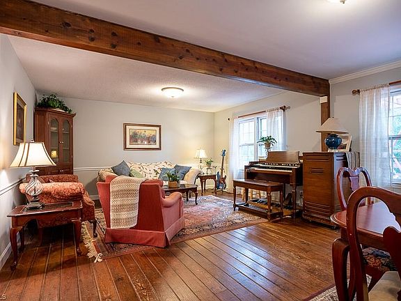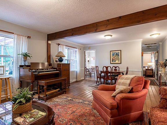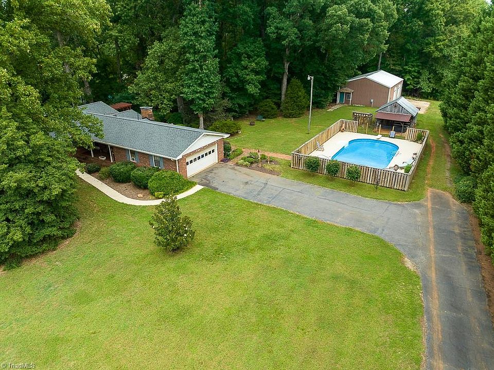 Excellent location on over 3 acres w/single level living just off the beaten path. With plenty of amenities! This brick ranch with main level living offers a renovated kitchen with custom handmade cherry cabinets. Large living room with exposed beams and a cozy den with fireplace. Breakfast nook looks out over the wooded backyard and wildlife through the bay window. Large deck is a quiet place to relax with mature trees for shade and privacy. Enjoy the rest of summer with the Inground Pool with privacy fence and custom pool decking and cover. Recent pool liner replacement. Old Tobacco Barn (wired) with concrete floor and recent roof replacement that would make a great Pool House. 40x30 Workshop with double garage bays is ready for heavy duty power tools with three phase wiring. Minutes from Restaurants, Shopping, and Interstates, but tucked away on private acreage for the best of both worlds! See Agent Only.