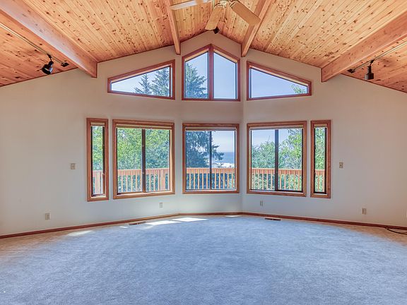 Lovely 3 bed/ 2bath home with ocean views from this prime location on Horizon Hill. Enjoy the wrap around deck, relax in the sunroom or cozy up in front of the fireplace. Featuring vaulted wood ceilings and accents within. Attached 2 car garage downstairs & workshop with single car garage upstairs. Interior is in wonderful condition (just needs a little updating) and siding/roof/deck are new. Most trees are on property and able to trim if you are interested in expanding the view.