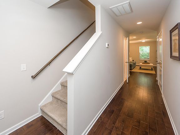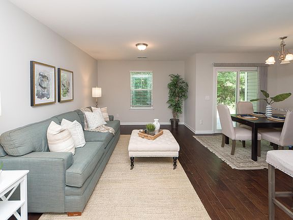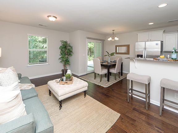 Gorgeous end-unit townhome that shows like a model! 3 bedrooms, 2.5 bath plus a 1 car garage! Nice foyer entrance hallway opens to the family room, dining area, and kitchen. Open concept! White kitchen cabinets, stainless steel appliances (including refrigerator), and granite countertops give this kitchen a striking look. The kitchen has a bar top area for casual dining. Hardwood floors span the 1st floor, and the ENTIRE home has a fresh coat of paint! Powder room is conveniently located downstairs and has a pedestal sink. Step outside onto the patio and enjoy the wooded/private view with a pond in the background. Upstairs you will find all 3 bedrooms. The master bedroom is spacious and has a large walk-in closet. The master bathroom has dual undermount sinks with a granite countertop, white cabinets and tile floor. Two guest bedrooms share a guest bathroom with granite countertops and tile floors. No more yard work! HOA fee takes care of yard work, landscaping, and termite bond. This home is a short walk to Goose Creek High School. Community has a pool, playpark, and sidewalks!