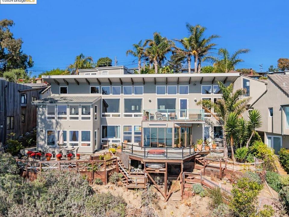 Price to sell! The House of 12 Palms is a breathtaking Frank Lloyd Wright-inspired waterfront estate with sweeping views of the San Francisco Bay, the Golden Gate Bridge, and Angel Island. This luxurious home offers over 3,700 sq. ft. of beautifully designed living space, featuring dramatic vaulted ceilings, stunning wooden beams, and exceptional artisan craftsmanship. The open layout is perfect for both entertaining and everyday living, highlighted by an extra large gourmet kitchen that seamlessly flows into the dining area and opens onto a large deck. Nestled on an 8,360 sq. ft. landscaped lot, the property includes multiple decks, a hot tub, and high-end finishes like 18" Italian tile and polished concrete floors. For entertainment, the home boasts a multimedia room with surround sound and a hidden "bar by the bay," complemented by artistic details like a custom-designed staircase and a hand-painted mural. Additional features include a two-car garage with four parking spaces, an elevator providing direct access to the front door from the garage, radiant heating for year-round comfort, and two electronically powered skylights for natural light. The House of 12 Palms combines luxury, artistry, and modern amenities, creating a remarkable waterfront sanctuary.