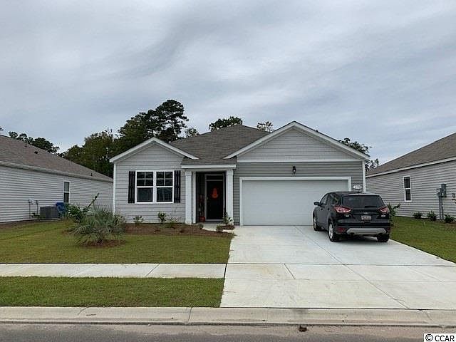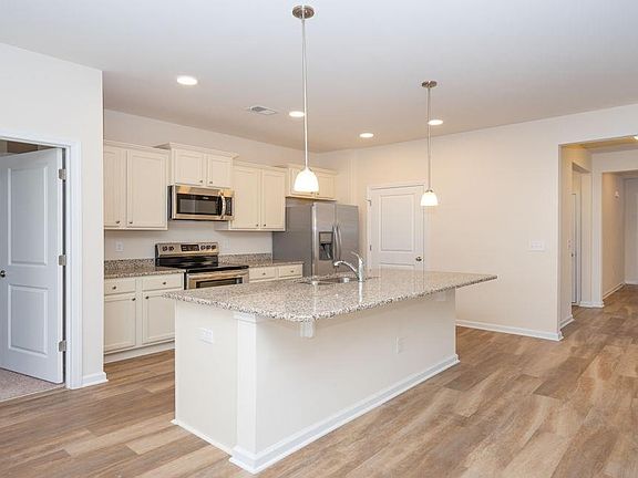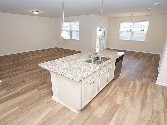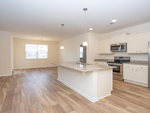 Our home owners will enjoy a gracious pool and hot tub, air conditioned pickle ball court/meeting space, walking trails and a short golf cart ride to the beach. The Aria floor plan is extremely open and feels larger than the square footage. The kitchen features stainless appliances (including refrigerator) and 36" white cabinets with pendant lights over the gourmet granite counter height island, all overlooking the spacious Living Room and Dining Room - great for entertaining! Low maintenance Solid surface flooring (resilient hardwood-look vinyl) throughout the living area, bathrooms and laundry room. From the Dining Room, sliding glass doors take you to a 12 x 8 ft. covered porch. Owner’s suite offers a large walk-in closet a garden tub, a 5 ft. shower, and double vanity. Washer, dryer and garage door opener included! We are the price-leader for single family homes in Market Common! Photos of home are of a model home of same floor plan in another community and are for presentation only. Square footages are approximate.