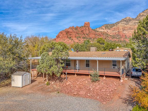 Dramatic, lovely views of Thunder Mt and Chimney Rock at the top of Harmony Knolls. Modern 2003 build w/ a 3/2 split floorplan. 2 living areas plus a fabulous covered 10' X 58' trex deck. Also featured is an enclosed AZ Room ( 10' X 23' not included in sq ftg) with straight on red rock views. Desirable N/S orientation. New roof in 2020, sky lights in bathrooms.Neighborhood has newly paved streets plus Thunder Mt Rd construction is close to completion with a much anticipated scenic sidewalk and bike lane. Short distance out back to National Forest Trail Head with some of the most spectacular Views and Trails Sedona has to offer. NO HOA. Excellent candidate for a prospering short term or long term rental in the heart of W.Sedona!