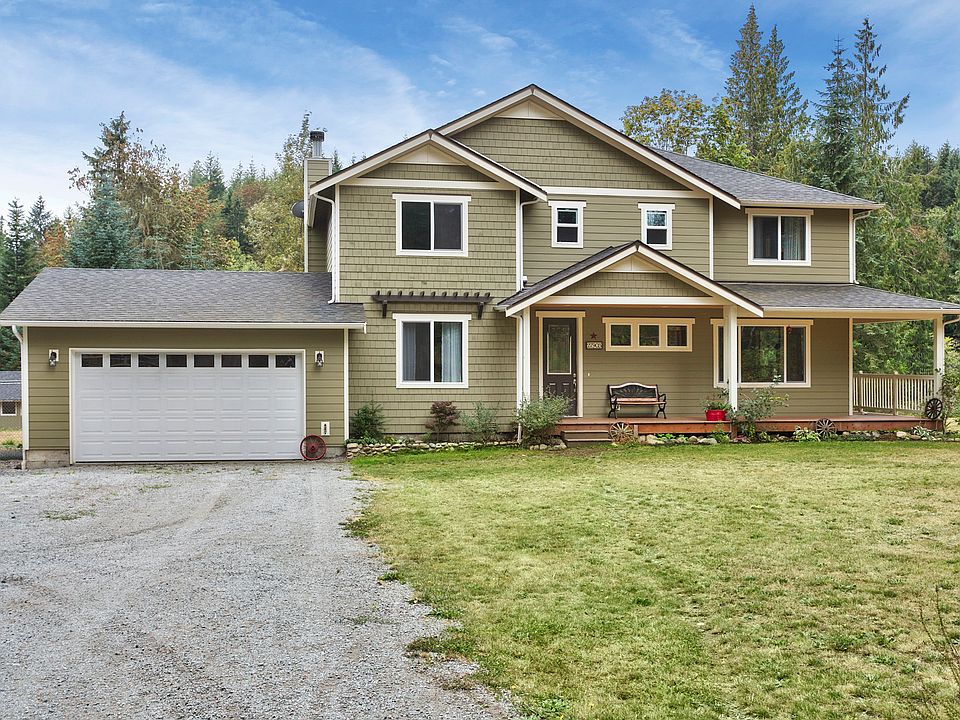 The backyard to this country estate boarders the Pilchuck Tree Farm, private access to horse trails w/multiple outbuildings, barn & potential for a shop! Wired for high-speed internet & a generator! Stunning living area w/efficient rock fireplace made from stones on the property, large picture windows & designer lighting fixtures. Spacious kitchen offers island, SS appliance package & double oven! Extending on the upper level w/walk-in closets throughout bedrooms & a true master bedroom suite!