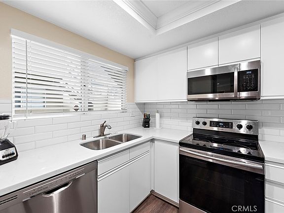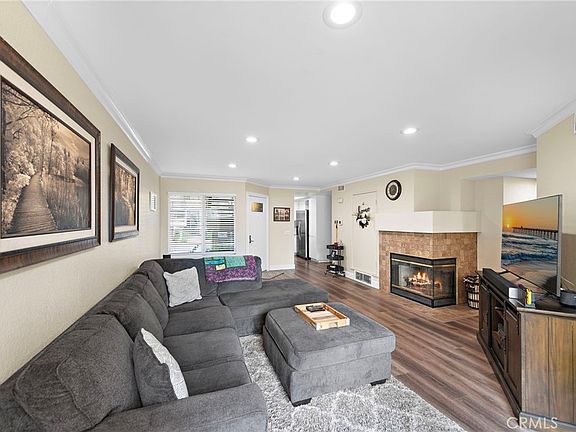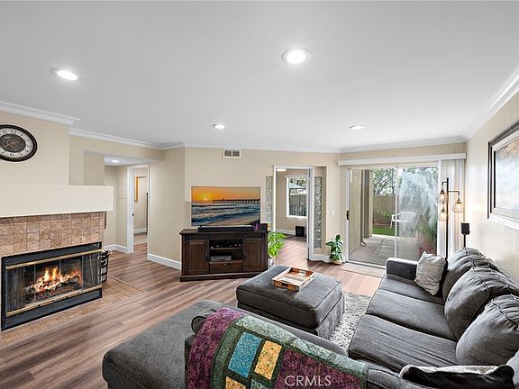 Welcome to this amazing two-bedroom condo with an expansive enclosed backyard, located in the desirable community of Rainbow Ridge. This ground-floor, single-level residence boasts an open floor plan with abundant natural light. The home has been thoughtfully upgraded with recessed lighting, premium vinyl flooring throughout, neutral paint, raised baseboards, crown molding, and more. The spacious living room features a cozy gas fireplace, and opens to the private, spacious backyard. The updated kitchen is complete with Quartz countertops, subway tile backsplash, stainless appliances, and direct access to the one car garage. The large primary bedroom offers a walk-in closet, a double-sink vanity separate from the main bathroom, and plenty of additional storage space. The remodeled bathroom includes granite countertops and beautiful walk-in shower. The second bedroom is perfect for use as an office, bedroom, or den. Enjoy entertaining in the generously-sized, enclosed yard, featuring large covered patio area, brick paver area perfect for an outdoor dining, and turf area. Rainbow Ridge offers its residents fantastic amenities, including a tot lot, two community pools/spas, sport court, and membership to Lake Mission Viejo.