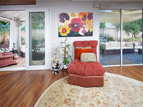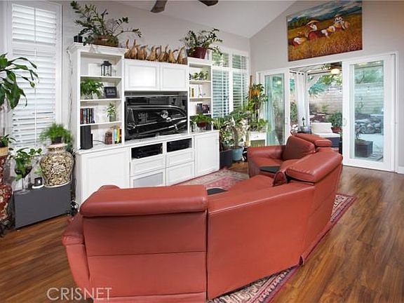 Welcome to this gorgeous home located on a cul-de-sac in one of Valencias most desirable neighborhoods, Northpark Community! The adorable front porch perfect for morning coffee overlooks the manicured front yard with lush grass. As you step inside you will see the 20-foot high ceilings highlighting the spacious living room, featuring beautiful hardwood floors, custom entertainment center and expansive windows that bathe the room in natural light! The living room also features a separate dining space and a quiant reading area! The thoughtfully layed out kitchen boasts gorgeous granite countertops, sleek black cabinetry, stainless steel appliances, built in microwave, crown moulding, breakfast bar area and a huge window overlooking the backyard with custom floating shelves. Downstairs also features a bathroom with a shower and bidet and 2 of the 5 bedrooms, each with hardwood floors and large sliding-door closets. Upstairs you will find more beautiful hardwood flooring throughout and a primary bedroom that is a true retreat with double door entry, peaked ceilings, crown moulding, and an ensuite bath thats every homeowners dream with separate shower, alcove soaking tub, large windows, modern dual sink vanity, separate enclosed toilet room with a bidet, and large walk-in closet. In the next bedroom you will find custom paint, crown moulding, ceiling fan, and mirrored closet. There is an incredible room with tons of custom shelving and cabinetry perfect for an office or craftroom! The full bath includes tile flooring, crown moulding, custom paint, vanity, and shower-tub combo. Another unique feature upstairs is the built-in storage with elogated countertop. Don't miss the backyard perfect for entertaining! Sliding glass doors off the living room provide direct access to the covered patio with huge seating area, privacy drapes, ceiling fan, and a gorgeous view of the backyard. Lush greenery and rock landscaping including an incredible 5 tier rock waterfall make the backyard your private tranquil oasis! The HOA also includes incredible amenities (only $45/month) including a Clubhouse, basketball court, tennis courts, BBQs and more! With a dedicated laundry room including plentiful cabinetry, storage, and counterspace, direct access to the 2 car garage, delightful large side yards and so many more features, this home has it all. Do not miss out on this beautiful home!!