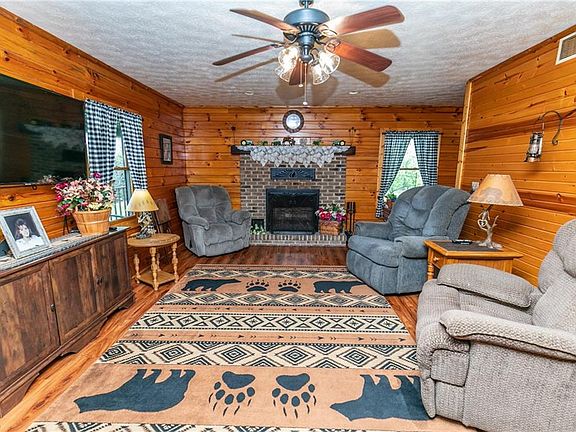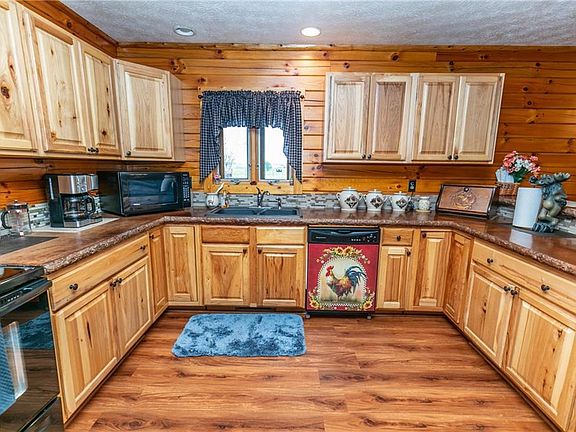 This amazing, Amish Built Pine Log Cabin is like a private retreat on 3 acres. The inviting wrap-around front porch provides peace and serenity. Once inside the front door of this warm and welcoming home, you'll notice the cozy wood-burning fireplace & laminate vinyl plank flooring throughout the main living areas(2019). The kitchen offers Hickory cabinetry, concrete countertops (2017), a breakfast bar, included appliances & is open to the dining area. The sliding door leads to the peaceful outdoors onto the wrap-around porch. Back inside, the owner's suite offers a wonderful en-suite bath. A second bedroom, 1/2 bath, & laundry room complete the main floor. The lower level offers a full unfinished basement that can provide more living space, once finished. The beautifully landscaped yard with a large pole barn providing electricity & various opportunities for uses. The exterior was sealed 2 times & Interior of the logs were sanded 7 times and polyurethaned 3 times for added strength & protection. The porch was also stained 3 years ago. This one-of-a-kind property has been lovingly cared for! Updates include; Furnace/Heat pump (2019), A/C (2019), GE Washer/Dryer (2020). Schedule your private viewing today!