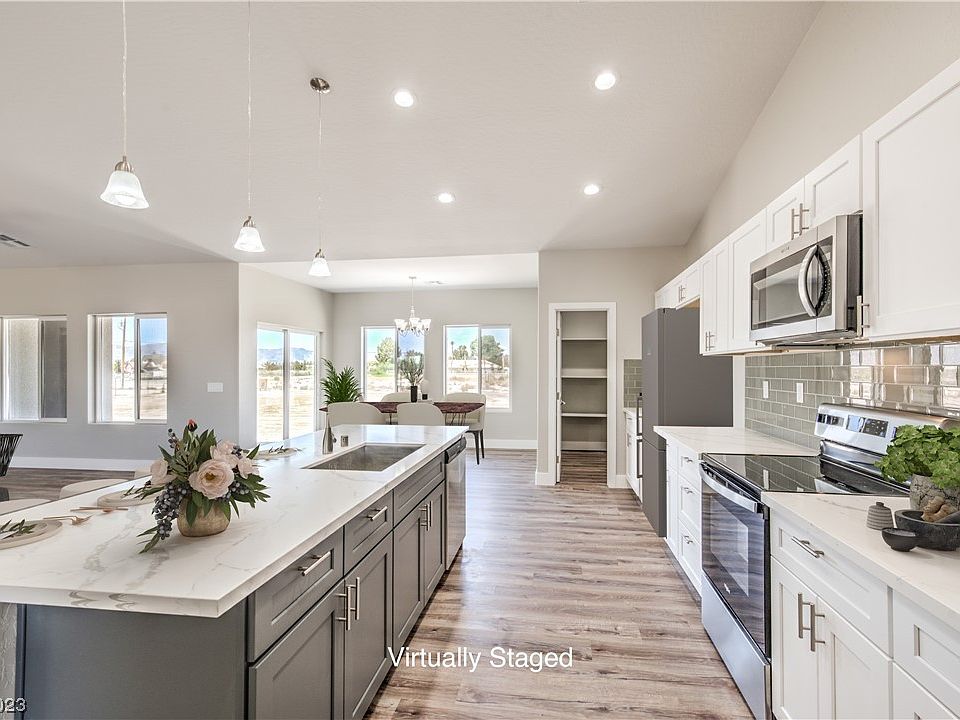 - Description: Breakfast Bar/Counter,Breakfast Nook/Eating Area,Granite Countertops,Island,Lighting Recessed,Man Made Woodor Laminate Flooring,Pantry,Solid Surface Countertops,Stainless Steel Appliances,Vaulted Ceiling,Walk-in Pantry