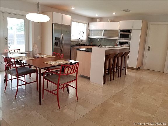 This home has been completed renovated inside and out in a contemporary style. Beautiful front impact door welcomes you into an open concept living room, dining room, kitchen area with marble flooring throughout. Open kitchen offers quartz counter tops, 3-ovens, stainless steel appliances and Ibiza glass back splash. French doors off of the dining area takes you to your screened in patio. Both the guest and master bathrooms have utilized high end finishes and fixtures. All 3 bedrooms are large with plenty of closet space. Finished garage could be a family room, office or media room. Recessed lighting and impact windows and doors throughout. Gorgeous back yard allows for additional privacy and solitude. Close to the Turnpike, shopping and entertainment.