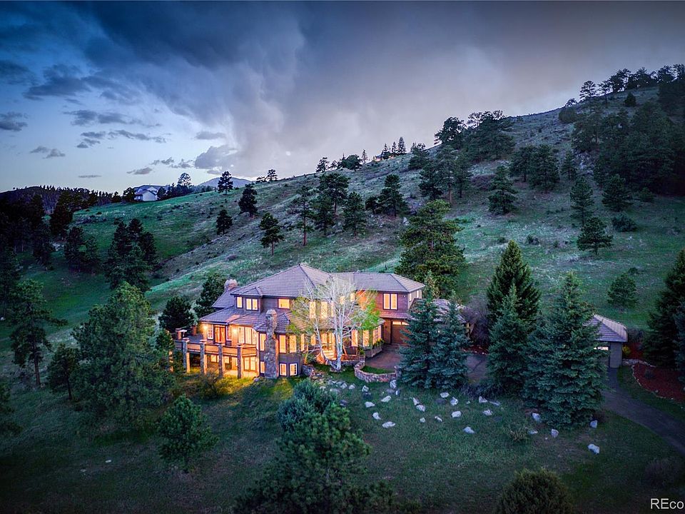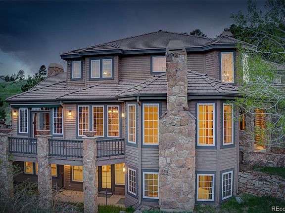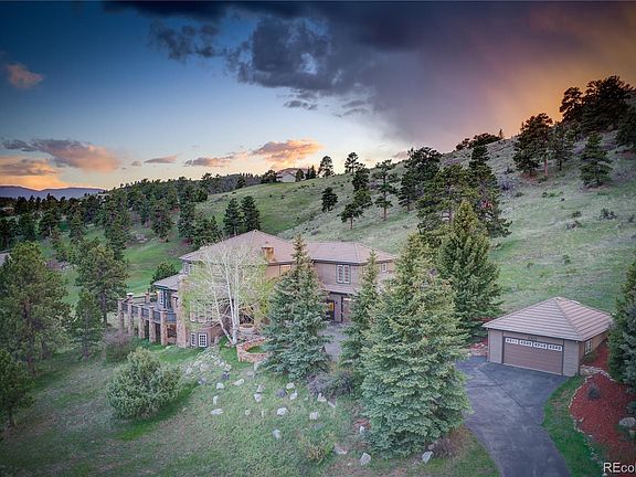 Spectacular Spring Ranch home located on 5 acres backing up to Genesee Park open space. One of the best lots in Spring Ranch with big sky and expansive mountain vista views. The ultimate in Colorado outdoor living with multiple doors accessing large wrap-around deck and fenced yard. Southwestern exposure provides beautiful sunsets and private setting for year-round outdoor entertainment. Grand entryway with open staircase greats you at the front door. This home offers several living areas to fit your lifestyle, including living room with fireplace, private study/office and window-wrapped sunroom. Enjoy the open kitchen and family room with massive rock fireplace that provides a central gathering place for your family and friends. Dual staircases lead to upstairs bedrooms and loft. Walkout lower level with rec room, wet bar, work-out room and additional bedrooms. Oversized three car attached garage with additional two-car detached garage. Convenience of Evergreen in your backyard!