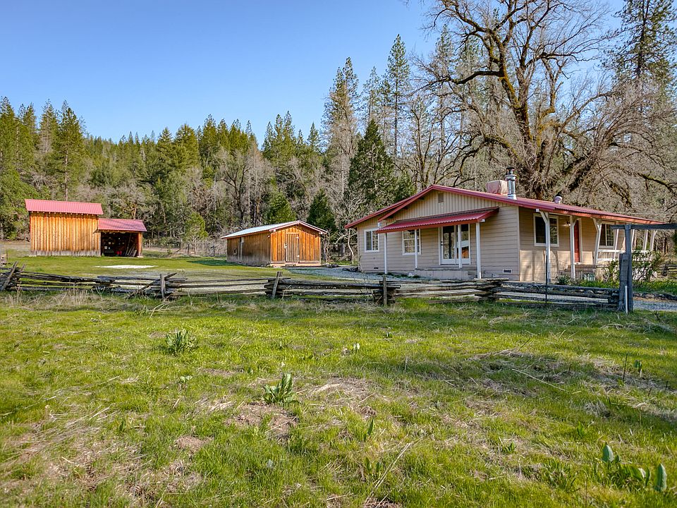 This truly is a special property. Great get away, or looking for peace and quiet, privacy, or your own mini farm. Creek frontage, mountain views, Barn for tools or livestock, outbuildings, fenced and cross fenced all at the end of a private road on 9+ acres. This 2 bedroom 2 bath home has an open feel with hardwood floors, White kitchen cabinets + new counters, updated lighting, Cozy wood stove, Gas heat, Energy efficient Vinyl windows, Tile bath surround, full walk in shower, Oversized laundry/ mud room. Upgraded Metal roof on home and barn. Ready for your horses, cattle, or exploring. All within a short distance to Redding.