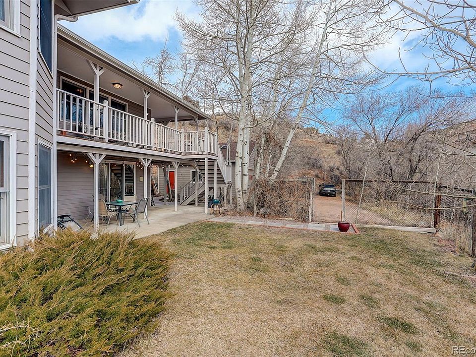 NEW PRICE! Welcome to this beautiful raised ranch home overlooking Bear Creek Canyon on .49 acres. This charming mountain home boasts a wonderful covered front porch with wrap around deck, perfect to take in the the gorgeous foothills valley and the sounds of Bear Creek. You will enjoy the main level living with 3 bedrooms and 2 baths, laundry, kitchen and dining room. Downstairs, you will find a great room, a non conforming bedroom, 2 bonus rooms(currently used a non-conforming bedrooms) and a large mud room, that lay out to potentially create/build another separate living area to lock off for rental or in law unit. The living room and kitchen have recently been painted, the dining room and master bedroom both have brand new flooring. There is a nice size fenced in area behind the home plus a deck off the master bedroom. A detached oversize 2 car garage, plus parking room for an RV, allows you and your guests plenty of room for your vehicles. The tax bill appears larger than normal due to the water bill being part of the tax bill paid to the water district. Be in the heart of the foothills, but have easy and quick access to Red Rocks/C470 off Highway 74. This home is move in ready and simply delightful!