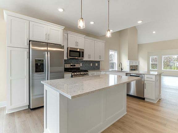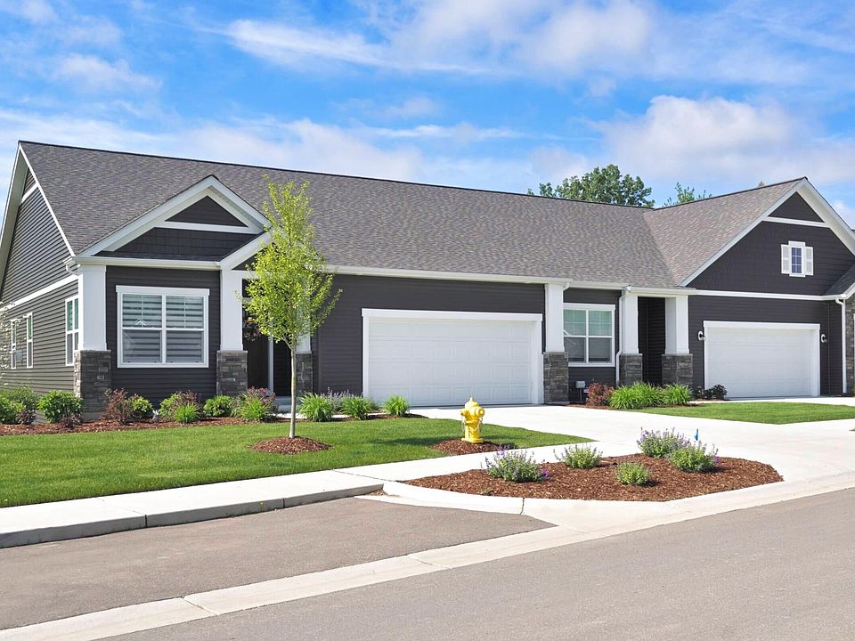 Stylish end unit condo with 2 stall garage -The Sunstone Plus floor plan features a vaulted ceiling in living room with soaring fireplace and adjoining four season room, 9' ceilings on the main and in the finished daylight lower level. The main level includes dining area, spacious kitchen with a center island and large peninsula countertops, kitchen appliances, main floor laundry room, 1/2 bath, primary ensuite with WIC and bath. The FINISHED LOWER LEVEL includes a family room, 2nd bedroom and full bath. Plenty of storage & closets. Community amenities: pool, playground, picnic areas, walkability. Enjoy the retail shopping, restaurants, airport & highway access. Welcome Home to Cobblestone at the Ravines, North Village!