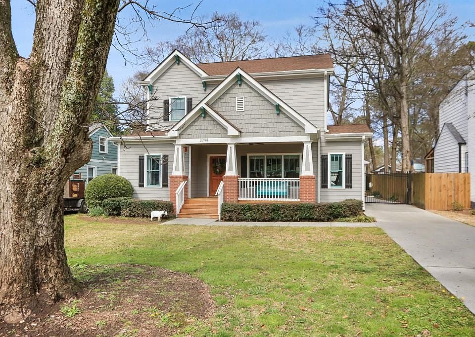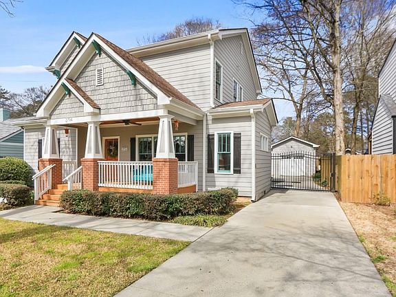 Located only 3/4 of a mile from Oakhurst Village, this East Lake Craftsman-inspired home has all of today's modern upgrades that buyers expect. From the moment you enter the home you are greeted with a charming covered front porch, just perfect for enjoying the neighborhood. As you open the front door you are presented with an open floor concept with sitting area, fireplace and built in bookshelves. Beyond this room through the door is a private dedicated office area. The kitchen is the pride of this home with a huge kitchen island, an abundance of cabinets, including under the island, gleaming granite counters, tiled back splash, two farmhouse style hanging lights over the kitchen island, a huge pantry, mosaic tile backsplash, and glass display cabinets. Off the kitchen is the dining area with coffered detailed ceilings and wainscoting. There is a bedroom and full guest bathroom suite on the main level. The main level bathroom has tile to the ceiling and a charming accent tile in the tub/shower and fun wall paper gives a fun vibe in this bathroom. The entire first and second floors are hardwood floors throughout. There is a nice size dedicated laundry room at the top of the second floor next to the owner's suite. The owner's suite has tons of light, but the owner's shower showcases tile to the ceiling with double shower heads at each end! Pebble tile floor and mosaic accent tile. Spacious closet with built-ins that stay, separate tub. There is an additional guest bedroom with a dedicated bathroom. All bathrooms have granite counters. Back downstairs off the dining room/kitchen area is a covered back deck, which can easily be screened in. A detached garage, electronic gate and flat private fenced-in yard complete this home. Located in the priority district for Drew Charter school.
