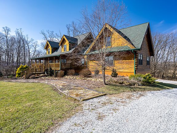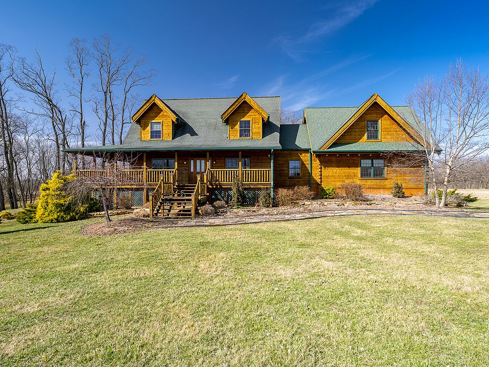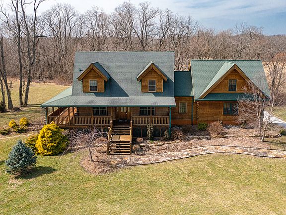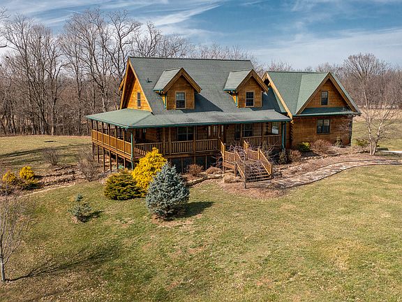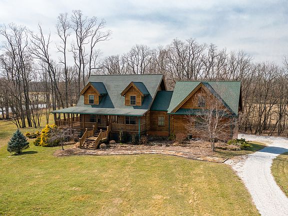 Amazing custom-built true log home on 35 acres with pond, outbuildings, woods for hunting and tillable acreage for income. Enjoy the stocked pond w/floating dock or pastoral views from the wraparound porch. The main floor features a massive great room w/vaulted ceilings, stone fireplace, wood beams, & formal dining room. Primary suite w/walk-in closet, custom shower & sitting rm. Kitchen w/large center island, quartzite counters & cherry cabinets. 2nd bedroom & full bath upstairs. Basement features a family room, 3rd bedroom, full bath, office & art studio. Heritage log home w/dovetail corners, mahogany trim, beautifully updated bathrooms, dual geothermal systems & many other upgrades. Livestock barn w/fencing & loft. Pole barn for storage.