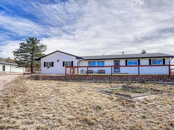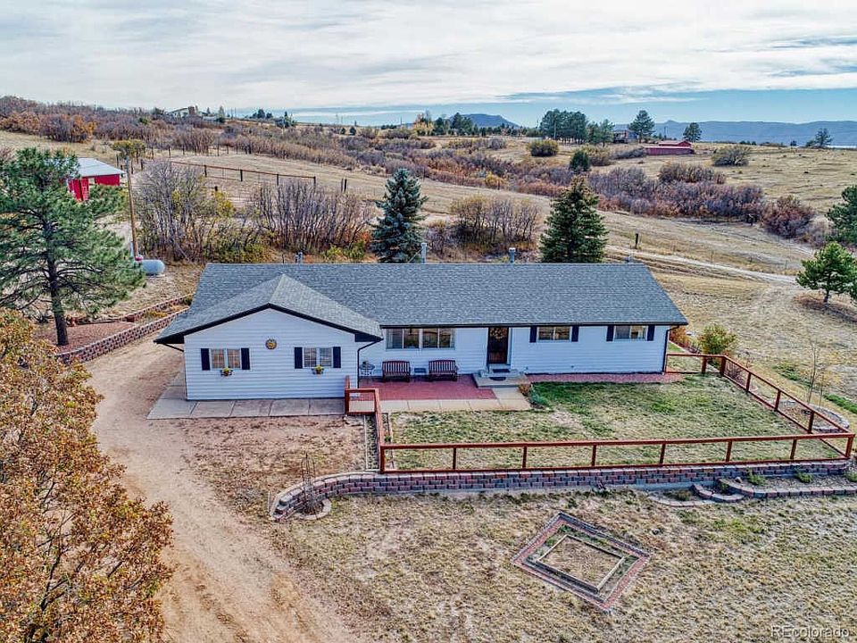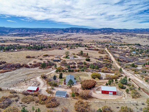 Ranch style home on 5 acres with amazing Mountain Views, a large workshop, loafing shed and pasture. Horse property! House features 4 bedrooms & 3 bathrooms, with a Master Suite w/mountain views, skylight, wood floors and attached bathroom. Spacious kitchen has a skylight, granite counters, newer cabinets, all appliances included, island and walk in pantry, and opens to dining area with wood burning stove. Living room faces beautiful mountain views and has built in bookcases, and flows into family room and office. Main floor laundry room/mud room - washer and dryer are included. Bonus 10x5 storage room. 3/4" wood flooring. Crawl space contains well pressure tanks, iron filter, salt water conditioner and furnace (propane, forced air). Beautifully landscaped, with front patio and fenced dog run, and back yard oversized deck with pergela and additional landscaping. Sprinkler system for lawn. Also features newer well, two 1000 gallon septic tanks and increased leach field, 500 gallon propane tank, livestock shed, 1 acre+ pasture, corral, 2 car garage with storage. Workshop is 32x48 with 2 garage doors -- 10x12 roll up and 12x11 garage door -- and a concrete floor, 100 amp electrical service, & extra storage space above. Property has 2nd electrical meter with power to outbuildings. Very close to Castle Rock and I-25 and easy access to Highlands Ranch/Littleton and C470 as well as to Colorado Springs. Douglas County School District. This is a rare opportunity to get acreage so close to town and with such amazing mountain views!