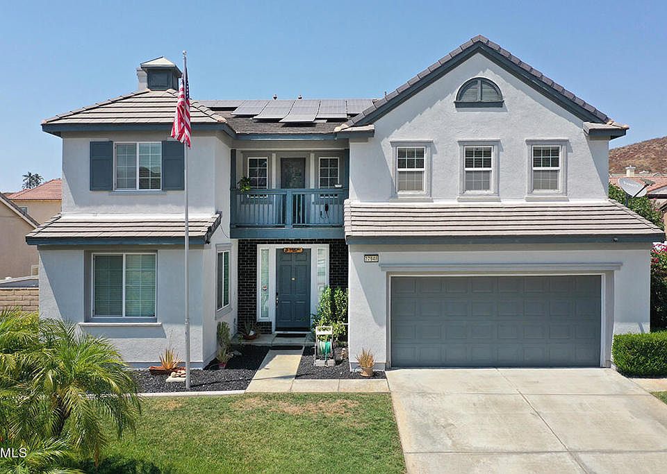 Assumable financing available. Nestled against a backdrop of majestic mountains, our home offers breathtaking views and a serene atmosphere. The exterior, freshly painted just two years ago, complements the modern aesthetic of the neighborhood. A solar system, fully paid for, ensures energy efficiency and cost savings.Upon entering, you're greeted by the warm ambiance of wood flooring and 28-foot ceilings in the living and dining room, contrasting elegantly with the new luxury vinyl plank flooring throughout the rest of the house. Every room boasts the comfort of ceiling fans, including the spacious main bedroom which spans the width of the house and features a large walk-in closet and a newly installed shower enclosure.The kitchen is a chef's dream, recently remodeled to include a new butcherblock island, a stone sink, quartz countertops, and a custom backsplash. Stainless-steel appliances, including a stove with double oven, complement the ample cabinet space with pull-out shelves and storage options.The accommodation extends downstairs to a versatile nanny quarters or in-law suite complete with its own private bath, ensuring privacy and comfort for guests or family members.Outside, the front yard features a harmonious blend of grass and gravel, accented by palm trees and roses. The backyard, designed for low maintenance and drought tolerance, includes palm trees, roses, DG (decomposed granite), concrete, gravel, and a practical shed tucked away on the side yard.Additional amenities include updated window coverings throughout, all-new screens, two AC units equipped with new ecobee thermostats for climate control efficiency, and a newer 75-gallon water heater for reliable hot water supply. Conveniently located near shopping centers, schools, parks, and major highways, this home combines comfort, style, and functionality in a desirable neighborhood setting.