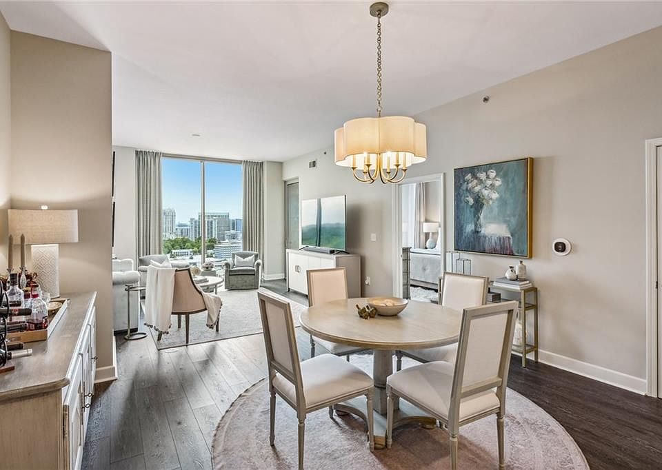 Enjoy a sophisticated lifestyle, exceptional amenities and breathtaking views from the 21st floor at Gallery, in the heart of Buckhead. This unusually spacious (approx. 1364 ft.²) one bedroom with an office has 10 foot ceilings and floor to ceiling windows offering natural light and panoramic views. The primary living area is open and light filled. Off of this great room there is a balcony, the owners suite, a bonus room and a full bath. The balcony, which is also accessible from the bedroom, is recessed and private - great for sipping your morning coffee or watching the twinkling lights of Buckhead at night. The bedroom suite has a walk-in closet, a large bath with dual vanities, marble floors, a shower and a separate soaking tub. The bonus room/office with a closet could easily be converted to a guest bedroom. Open to the great room, the bright refurbished kitchen has stone counters and stainless appliances, new hardware, and lighting. Well maintained and updated with new hardwood flooring throughout, designer lighting, a new-ish HVAC and hot water heater, this lovely condo comes with a deeded parking space in the gated parking deck. Exceptional amenities are right at your fingertips: 24/7 Concierge, Luxurious pool and terrace with community grill and outdoor fireplace. Updated club and media/theater rooms with catering kitchen for hosting events. Library and business rooms. Fully equipped fitness center. Lighted tennis/pickleball courts. 3 Guest suites. Electric vehicle charging stations. Dog walk/park. Art gallery lobby featuring exhibits of fine art rotating every 3 months throughout the year. Gallery is in proximity to fine restaurants and Buckhead Village shops.