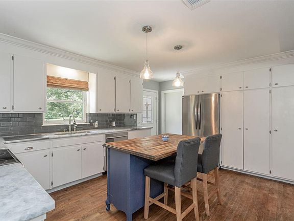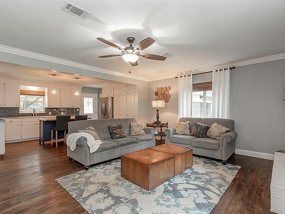 Remodeled home with a farm house feel! Oak floors meet you at the front door and continue on throughout the main areas of the home. The Living Room features an aesthetic fireplace with a modern wood mantel, crown moulding, and an open floor plan. The Kitchen is large with a butcher block island created with an antique dresser. The wall of cabinets creates a wonderful pantry and perfect place to hide your microwave. Marble counter-tops, under-mount sink, new lighting and updated appliances finish off the Kitchen. Just off the Kitchen is the Formal Dining Room which features French Doors leading into the backyard. The Main Bathroom is stunning with a new double vanity, tiled tub surround, tile flooring and updated lighting. The Bedrooms are all good sized with new carpet! The house has many great updates including a new roof! Come take a look for yourself!