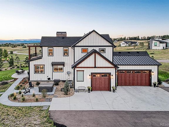 Exceptional custom built Adamo home in the coveted Fox Hill neighborhood in Franktown. This beautiful two story modern farmhouse will not disappoint. Enter this beautiful home through the custom knotty alder french doors; you will find a vaulted two story foyer with designer lighting, hardwood floors, brick accent walls, ship lap, exposed wood beams, knotty alder custom wood work, custom tile work, and a functional cozy floor plan all on 1.83 acres. The main level has a study or a functional main floor bedroom with an ensuite bathroom. The chef's kitchen boasts a large island with quartz, Bosch appliances, gas range, wine cooler, and an open concept to the formal dining room and great room making it ideal for entertaining. You will also find a large mud room / laundry room just off the oversized 3 car garage. The upper level has three bedrooms including the primary suite with an ensuite bathroom, walk in closet and a deck with mountain views making for a private oasis. The upper level also has a full bathroom and a large loft or bonus room with vaulted ceilings and a ship lap accent wall. The lower level is partially finished with a large family room, bedroom and a bathroom. The remaining basement sq ft is ideal for someone to add another bedroom or have a large storage area. Fox hill is an ideal location in close proximity to Franktown, Parker, and commercial or personal services. Set your showing today!