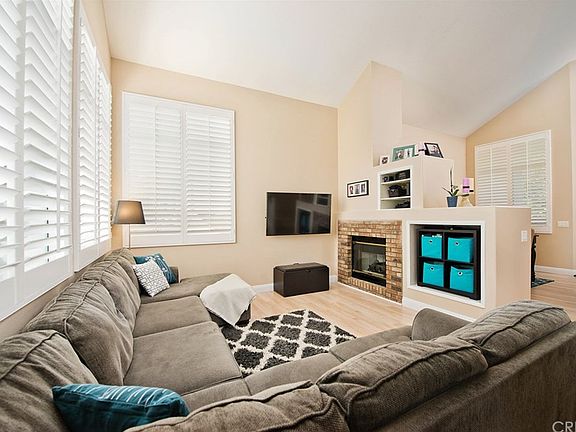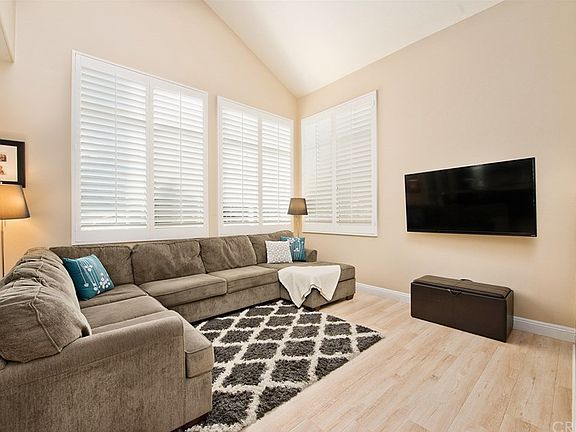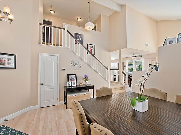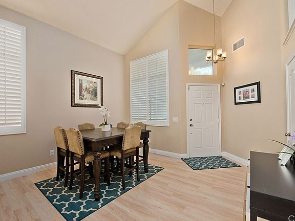 Lovely home situated in the highly desirable Valencia Northpark community featuring 4 bedrooms, 3 bathrooms and a 3-car garage. Light and bright dining room upon entry and family room with a cozy fireplace. The family room opens to the kitchen complete with refinished cabinets with newer hardware, stainless steel dishwasher, newer stainless steel range and microwave, breakfast bar, kitchen eating area and a large window with a view of the yard. Upgraded wide plank laminate flooring throughout downstairs, refinished banister, newer ceiling fans, and high baseboards and plantation shutters throughout the home. Downstairs bedroom and bathroom with shower. Spacious master bedroom and ensuite bathroom with separate bathtub and shower, dual sinks and a walk-in closet. Two additional bedrooms upstairs and a full bathroom. Laundry conveniently located inside the home. French doors leading out to the well landscaped and manicured yard with a lemon tree. Known for it's beautiful amenities, the Northpark community includes tennis courts, three swimming pools with hot tubs, kiddie pools, a basketball half court, and a modern rental clubhouse with a full kitchen and outdoor barbecues. Walking distance from Northpark Elementary School, Chesebrough Park and shopping center. Low HOA and no Mello Roos.