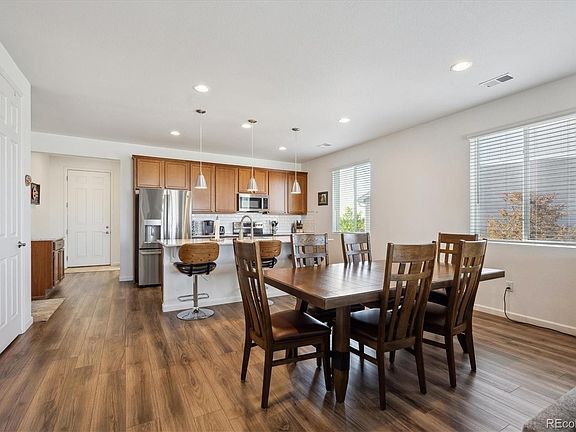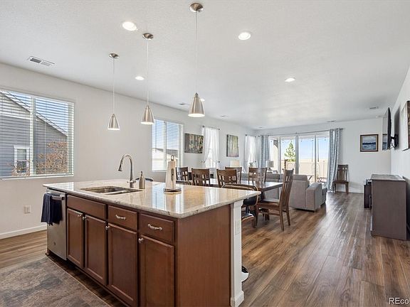 BUYERS GOT COLD FEET! Welcome to this beautifully maintained ranch-style home, ideally located in the highly desirable Sky Ranch community. Inside, the sunlit main level is filled with natural light from expansive windows. Elegant LVP flooring flows through the open-concept living and dining areas, creating a seamless transition into the kitchen—perfect for both everyday living and entertaining. The kitchen is a chef’s dream, featuring stainless steel appliances, stunning granite countertops, a stylish tile backsplash, and a large island with built-in outlets—ideal for casual dining or meal prep. Abundant wood cabinetry with crown molding, recessed and pendant lighting, and a generous walk-in pantry complete this impressive space. A versatile home office offers flexibility and can easily serve as a playroom or quiet study area. The primary suite is a peaceful retreat, featuring a spacious walk-in closet and a luxurious ensuite bath with dual sinks. Two additional bedrooms share a full hall bath, offering comfort and convenience for family or guests. Step outside to your private backyard oasis with no rear neighbors. Enjoy both covered and open patio areas—perfect for morning coffee and taking in a breathtaking Colorado sunrise. The beautifully landscaped yard includes vibrant flower beds, raised garden beds, and a Tuff Shed for additional storage. A 4-zone sprinkler system ensures easy maintenance year-round. New Class IV roof shingles were installed in 2024! Located close to parks, playgrounds, major highways, DIA, Southlands Mall, shopping, dining, and entertainment, this home offers the perfect blend of comfort, style, and community.