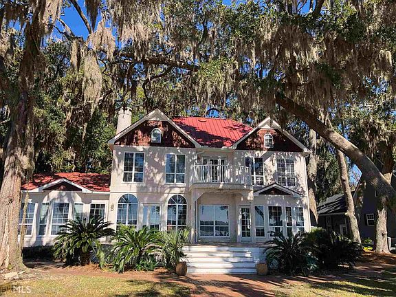 Deep water Victorian style tabby stucco home in gated Sutherland Bluff Plantation! Highly sought after deep water lot with stunning views of the Sapelo River and marsh beyond from every room! Three master suites, 4 full baths, and lots of natural light. Sold fully furnished! Beautiful large moss draped trees frame the peaceful water and marsh views. Three car garage with ample additional parking on the circular driveway. Easy access to Savannah, Brunswick, St. Simons and Jekyll Islands. Close to golf, fishing, Sapelo and Blackbeard Islands, and Harris Neck National Wildlife Refuge. Community amenities include clubhouse, community dock, pool, and tennis courts. This home's private dock walkway out to the floating dock will need to be repaired from previous storm damage. The floating dock and pilings are still there. The house will be getting new windows and railing for the back deck.