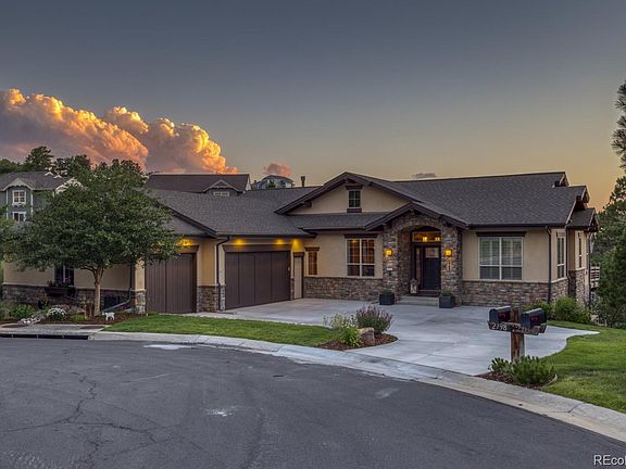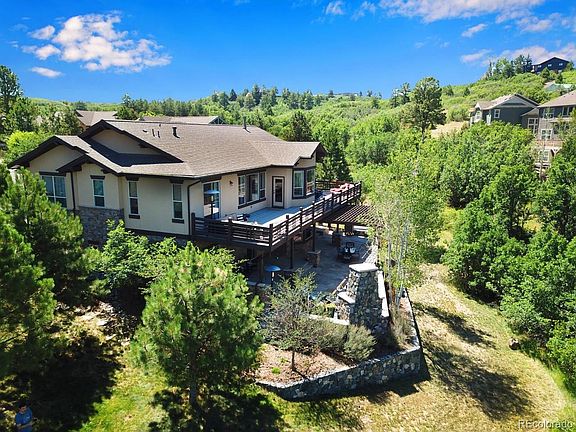 Million dollar views and highly sought privacy. This stunning custom home offers the best of both worlds, an elegant retreat with amazing mountain views in the tranquil community of Escavera. Situated at the end of a cul de sac, this home was designed and sited to showcase Colorado's magnificent views, sunsets, and provide the utmost privacy. Love to entertain? Look no further. The open floor plan emphasizes a gourmet kitchen with slab granite, 42" hickory cabinets, gas cook top w/custom tile back splash, dbl ovens, new dishwasher and newly refinished hardwood flooring. Eating space in the kitchen and a handsome formal dining room offer multiple dining options. Plantation shutters dress the windows throughout the main level. A gas fireplace in the living room keeps you toasty on chilly Colorado nights, and an upper deck that expands the length of the home is the ideal place to enjoy our magnificent sunsets. The private master retreat won't disappoint with French doors that open to the deck, a spacious master bath with dual vanities, spa shower, jetted tub, his & hers walk-in closets. A second bedroom, w/en-suite bath, home office and large laundry/mud room complete the main level. The walk out lower level is where the fun begins! Over 2500 sq ft consists of three large bedrooms, one w/en-suite bath the other two a Jack & Jill, an additional half bath, massive great room with wet bar & granite counters, and two rooms for storage and mechanicals. The covered flagstone patio boasts an outdoor grill, gas fireplace, dry sauna, newer hot tub, all surrounded by lush vegetation and native landscaping. Meticulously maintained home with new driveway, interior paint, and A/C. If you appreciate understated elegance with exacting attention to detail, a thoughtful layout and design, and yearn to escape the hectic pace of the city, congratulations, you've found your new home. Home Warranty Included!