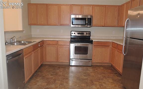 Large 3 bedroom 3 bath 2 car attached garage Townhome close to Ft Carson and Peterson Air Force Base. Great End Unit in quiet Spring Creek neighborhood. Two stories, with all the beds on the same floor. Two full baths upstairs, both with double vanities and linen closets. Lots of closet space and storage under the stairs! Extra storage space available in the attached 2 car garage! Central air conditioning. Stainless steel appliances. The largest unit built in this complex by this builder.