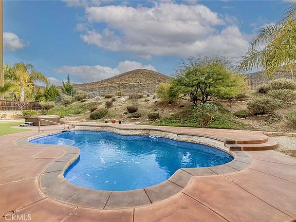 WOW! Welcome home to this STUNNING Menifee Pool and Paid off solar home NO MONTHLY ELECTRIC BILL! This amazing 4 bedroom (potential 5th) home has it all! This Pulte-built home boasts 2516 square footage and an open floor plan creates plenty of opportunities for family gatherings or neighborhood parties. When you arrive home, you will step into your luxurious living room and formal dining area. A bonus room (potential 5th) is perfect for your home gym or work from home space! The modern kitchen allows you to work efficiently when preparing meals for your family. Features include granite counters an island, a pantry, & extra storage space! This home includes newly installed LVP throughout the home and bedrooms and updated paint. Down the hall welcomes a spacious master bedroom including a spacious walk-in closet, white barn door, and custom paint with your master bath including dual sinks and storage. Down the hall greets 3 additional spacious bedrooms, full bath and direct access to your laundry room. The backyard is an entertainment dream! This backyard oasis is complete with a pool and spa (pool solar heating) and mountain views! For those wanting to remain in the shade, an alumawood patio cover with ceiling fans will provide comfort and cover for your stained concrete patio. The backyard includes a storage shed, and fruit trees: peach, Asian pear, orange, lemon on a 1/3 acre lots with fully fenced in uphill along the mountains has walking trail in an excellent neighborhood! Located nearby lots of shopping center, restaurants, LA fitness, Target, Lowes, groceries, gas stations, banks, medical center, golf course and others within a mile and easy access to 215 & 15 freeways! Don't miss out! Ring Security System (Front door, driveway, and Backyard cameras)