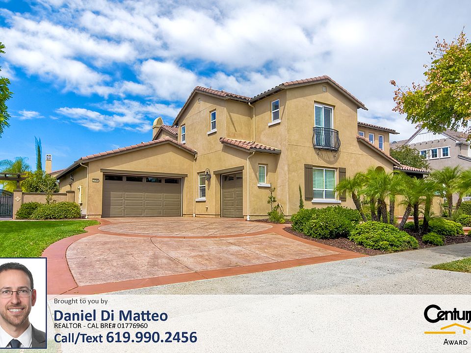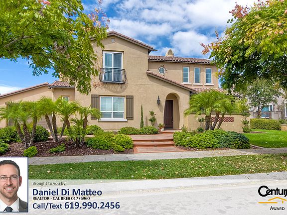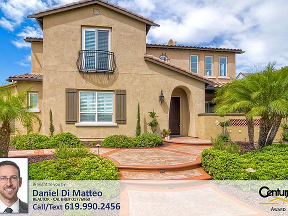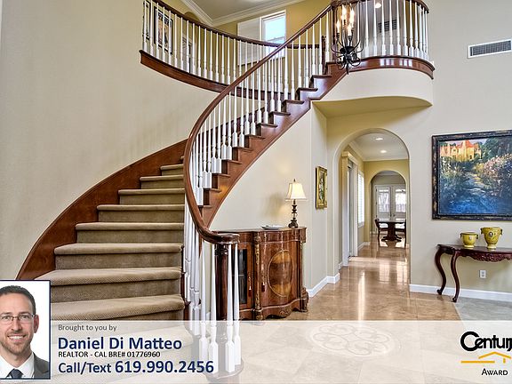 Listed by Daniel Di Matteo (619)990-2456 / dimatteogroup.com Take a 3D Tour: https://my.matterport.com/show/?m=pV9a7dqxTsh On a peaceful cul-de-sac sits this executive style property. As you enter you are greeted by the stunning wood trimmed spiral staircase accentuating the vaulted ceiling, travertine tile, baseboards & crown molding. The gourmet granite & stainless steel kitchen features a butler's pantry, an expansive island & opens to a spacious family room while the master retreat complete with fireplace & built-in wine fridge, overlooks the central courtyard from its private balcony. The 1/3 acre lot is comprised of park-like side yards leading to a beautifully designed area featuring an 18x14 pergola, built-in bbq, outdoor fireplace & seating walls. More features include plantation shutters, granite counters, custom fireplaces, walk-in closets, dual zone A/C and much more!