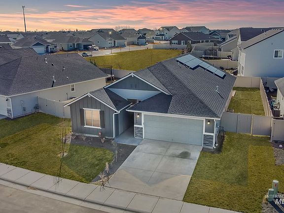 LIKE NEW!!! This home features 4 bedrooms, an owned solar panel system, home security system powered by Vivint, a community above ground pool, and was newly built in 2020! Open floor concept for entertaining family gatherings and those upcoming summer BBQ's. Over sized patio with RV parking potential with minimal modifications. Vaulted ceilings, dual vanities in master, with a Walk in closet. Kitchen features white cabinetry with crown molding, stainless appliances, tile backsplash, and an island. This home has it all. Located in crimson point sub and Less than 10 miles from I-84!