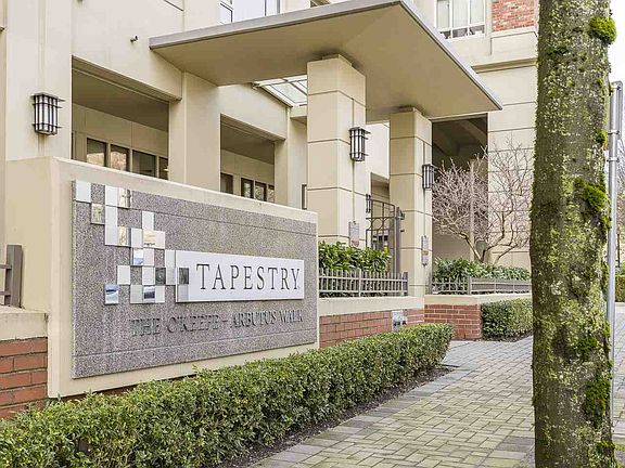 First class retirement living at Tapestry at the O'Keefe, located in popular Arbutus Walk. Join this community focused on wellness and active living. Enjoy beautiful northwest views from this corner suite with wrap-around balcony. Move-in ready, newly painted and carpeted, bright and spacious 2 bedroom, 2 bathroom apartment also offers in-suite laundry and gas fireplace, 1 parking and 1 locker. Pets allowed. Subject to service agreement. Some of the many amenities include gourmet dining, weekly housekeeping, recreation, 24 hr emergency response, phone & cable, media hall, computer centre, games room, spa/wellness centre, lounges, dining room, bistro, private dining room, fitness centre, hair salon, and roof top terrace. Walking distance to parks, shops, and transportation.