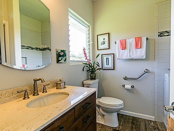 Beautifully designed home with island-style flair and a chef’s kitchen is looking for a new owner to love it as much as the current owners do! The property offers manicured privacy with an abundance of fruit trees, including Ulu, banana, multiple avocado varieties, lime, lemon, papaya, tangerine, and orange, plus over 20 raised bed planters for fresh essentials. The garage, equipped with a half bath, can be easily converted into additional living space. A breezeway is perfect for gatherings, and an outdoor shower adds to the tropical charm. A stylish ramp has been incorporated into a lanai that wraps 2 sides of the home. It’s the perfect access to the outdoor kitchen situated handy to the one inside. Inside, the kitchen boasts extensive counter space, a spacious pantry, gas stove, shaker-style cabinets, and even granite window sills. The main living areas feature 9-10 ft ceilings that rise to a 12-ft vault, creating an airy, open feel. A central space, used for dining features a built-in wall of bookcases just next to a cozy reading nook that could also be used as a sewing room or home office. Yoga anyone? Two nicely-sized bedrooms, each with an ensuite bath, flank another versatile den/office area. The primary suite offers direct lanai access and stunning views of the gardens. The luxurious bath offers a curbless shower featuring oversized seating, a rainhead shower, dual shower heads, and built-in toiletry nooks. The ensuite bath in the guest room offers a walk-in tub. Both baths have quartz counters. Wood-look ceramic floors provide durability and warmth, while single-hung windows invite natural light and add to the island styling. Even the garden shed reflects the island aesthetic. The lush property is set back from the road and extends to a serene stream just beyond the rear fence. The home has been meticulously designed and maintained and is ready for new owners to continue it’s Island tradition.