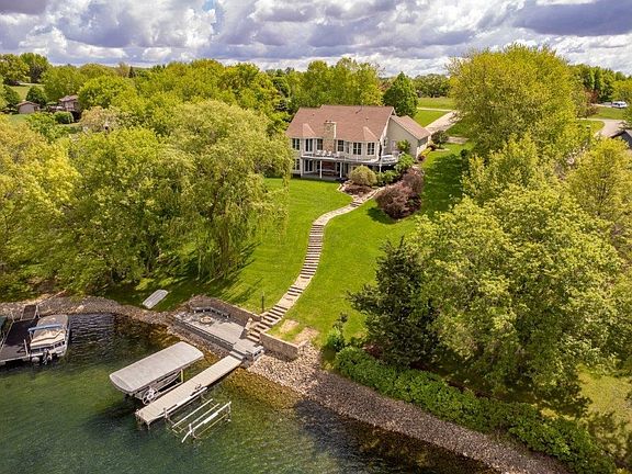 This is LAKE living at its finest! Whether it is full-time or a weekend retreat you are in the market for, this highly updated waterfront home should definitely be at the top of your list. The home is located on 1.17 acres with mature trees and lush landscaping. The 104 foot of water frontage offers good depth and is equipped with a pier and 2 lifts (to be included). The large patio and fire pit at the water’s edge offer the perfect place for roasting S’Mores and your front-row seats for Fourth of July fireworks! Enter this updated and expanded home into the great room with a vaulted ceiling, a spectacular fireplace, and a wall of windows looking out to the stunning yard and LAKE! This room is large enough for entertaining yet cozy enough to just hang out in. The nicely (just) remodeled kitchen and attached dining area look out to the resurfaced deck. This amazing deck extends the entire length of the house overlooking the large lush yard and has the perfect view of the lake. This is a great place to BBQ, dine outdoors or to just relax and enjoy the view. The laundry room is also on the main level. The large primary bedroom on the main level, opens to the deck with stunning lake views. The ensuite bathroom remodel was tastefully completed in 2024. It features a huge walk-in shower, two new vanities, and an extra-large walk in closet. The main level also features a second bedroom that is light and bright with direct access to the second bath. On the walkout lower level you will find a large family room complete with 4 bunks, a cozy fireplace, and a game room. PLUS there are two more bedrooms and 2 more bathrooms. One of these guest quarters is a newer ensuite with lovely French doors to the beautiful yard and lake. There is a massive mechanical room complete with extensive storage. Some of the updates: Trex decking and aluminum railings with stainless cables (2017) Lower level ensuite (2018) Furnace (2018) Whole house generator (2020) Water softener and treatment system (2020) AC unit (2021) This turn-key home is being sold with all (newer) furniture.
